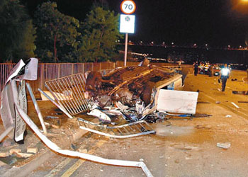 至21日凌晨零時27分,亡命飛車駛至深井青山公路,爬頭欲超越前面的士,但車頭撞上的士左尾部,全車失控鏟上路中安全島,反彈狂撞左邊行人路和路牌,全車反轉四輪朝天,車頂壓扁,前后擋風爆裂,四個車輪撞至彎曲,車內兩人頭爆重傷被困。被撞的士則向前沖出30米,打轉掉頭才停下,車內司機和兩名女乘客同告頭頸受傷被困。
