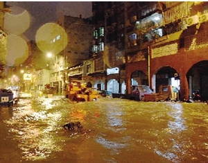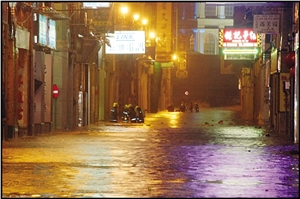 澳門沿岸海面23日現(xiàn)驚濤駭浪,漁船紛回港暫避。內(nèi)港、新馬路一帶晚上10時(shí)后出現(xiàn)海水倒灌,加上傾盆暴雨,路面最高水深至小腿。新馬路內(nèi)街出現(xiàn)水浸,電箱冒煙,大廈停電。福隆新街一帶水浸嚴(yán)重,高達(dá)1米,浸過變電站,電力公司被逼關(guān)閉電源,一帶商鋪全部被淹,料損失嚴(yán)重。