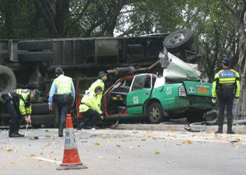 消防員接報(bào)趕至現(xiàn)場(chǎng),發(fā)現(xiàn)被壓扁的的士車廂內(nèi)躺著6名男子,但已全部氣絕身亡,部分人更被壓至面貌變形,頭顱爆裂。警方事后驗(yàn)出被告酒精含量是153微克,超標(biāo)6倍半。