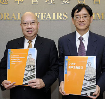 香港選舉管理委員會主席彭鍵基(左)公布立法會選舉活動指引,并促請候選人熟讀指引。(圖片來源:香港特區(qū)政府網站)