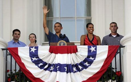 在第一夫人米歇爾的陪伴下,奧巴馬在白宮南草坪發(fā)表了講話。奧巴馬夫婦邀請了1200位賓客,其中有現(xiàn)役軍人、傷殘士兵、海外人士、和陣亡士兵家屬等等。
