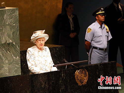 伊麗莎白二世今天作為英國(guó)、加拿大、澳大利亞等16個(gè)聯(lián)合國(guó)成員國(guó)的女王和擁有54個(gè)成員的英聯(lián)邦最高元首站在聯(lián)合國(guó)大會(huì)會(huì)場(chǎng)演講。