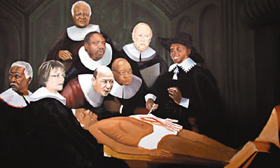 該幅油畫出自當地藝術家達馬素,是17世紀著名畫家林布蘭描繪12歲艾滋病斗士恩科西-約翰遜的《杜爾博士的解剖學課》現代版。
