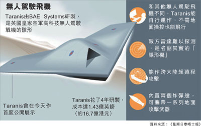該無人駕駛飛機名為Taranis,是雷電之神的名字。Taranis由BAE Systems聯(lián)同Qinetiq、勞斯萊斯和GE Aviation花了4年時間研制,成本達1.43億英鎊,將于明年作飛行測試。