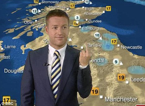 英國廣播公司天氣節目主播日前在節目中做出令人大跌眼鏡的舉動,他當眾朝新聞主播豎中指引發熱議。