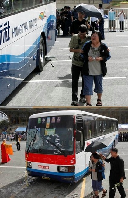 8月23日上午9時許,21名香港游客在馬尼拉遭一名菲律賓前警官劫持。菲當局派出談判專家,試圖通過和平的談判方式解決危機。但是形勢在當晚7時40分許急轉直下,遭劫持巴士內傳來數聲槍響,菲警方隨即實施突擊解救行動,將劫匪擊斃。