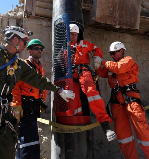 搭載受困礦工升井的是海軍特制救生艙“鳳凰號”,意欲礦工在脫困后“重生”。救生艙僅及肩寬,兩端分別裝有8個(gè)導(dǎo)向減震輪。艙內(nèi)將安裝一架攝影機(jī),鏡頭將聚焦礦工臉部及氧氣罩與雙向溝通器,設(shè)計(jì)升降速度為每秒1米。如果在升回地面期間出現(xiàn)險(xiǎn)情,礦工可以脫離救生艙,借助滑輪慢慢返回地底。