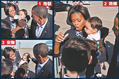 米歇爾拉票時,抱起一名嬰兒以博選民歡心;沒想到奶瓶掉到地上令男嬰大哭,她一時愕然;奧巴馬即時伸手安撫。