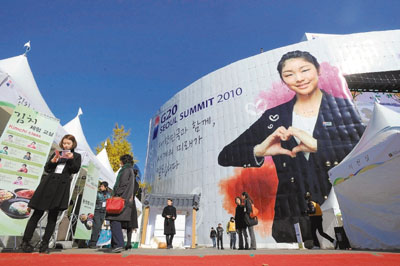 峰會主辦方別出心裁,推出峰會宣傳大使,是G20峰會歷來第一次。結果,冬奧會金牌得主、當紅滑冰選手金妍兒和足球運動員樸智星,以及憑《燦爛的遺產》竄紅的韓孝珠當選。