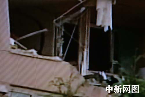 電視畫面顯示小型飛機撞擊公寓大樓后的情形。