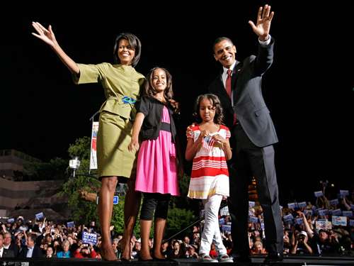 奧巴馬一家人站在艾奧瓦州講臺上,感謝選民熱情支持。