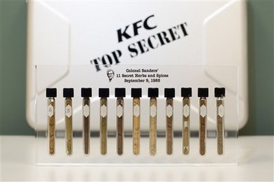 數(shù)十年來,外界只知道肯德基的炸雞食譜是由十一種草藥與香料調(diào)配而成,但究竟是哪十一種草藥與香料,比例、成份又是多少,從來無法進一步得知。為了保護食譜內(nèi)容不曝光,肯德雞數(shù)十年來都是分別向不同的食材供貨商購買材料,因此供貨商也不知道完整的食譜成份。