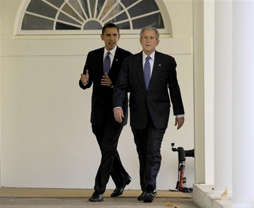 當地時間2008年11月10日下午,美國總統布什在白宮歡迎當選總統奧巴馬與其夫人米歇爾·奧巴馬的到訪。布什與奧巴馬在總統的橢圓形辦公室進行了秘密會談,而第一夫人勞拉則帶領未來的第一夫人到白宮各個角落踩點。