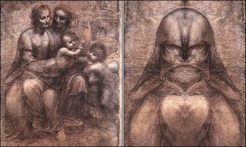 畫作“圣母子與圣安妮”中,似乎也反射出類似影像。專家說,達芬奇打算藉畫作表現出上帝本身,并且激發恐懼。在“施洗者約翰”畫作中也藏著另一幅圖像,。而以鏡子反射“最后的晚餐”,似乎也會發現圣杯倒放在桌上。