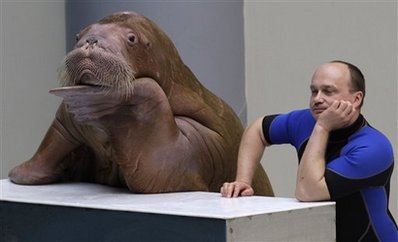 雌性海象“薩拉”在它的俄羅斯籍訓練員謝爾吉指示下,用一只鰭足撿起一件類似簫的銅管樂器吹奏。