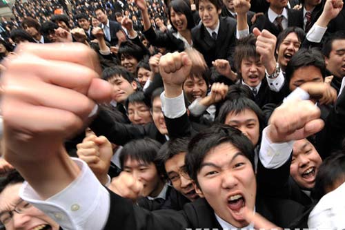 2月5日,在日本東京舉行的一個求職者集會上,大學(xué)生們振臂高呼,互相鼓勵并為自己加油。