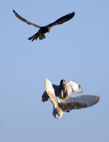 中新網2月6日電 據英國《每日郵報》5日報道,攝影師近日拍攝到了猛禽“空戰”的精彩照片。照片中顯示,一直谷倉貓頭鷹在白天覓食時遭到兩只茶隼的伏擊。