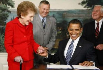 奧巴馬扶著88歲的南希慢步走進(jìn)儀式禮堂。來(lái)到簽署臺(tái),南希站在奧巴馬旁邊,左手扶在奧巴馬的肩膀上看奧巴馬簽字。