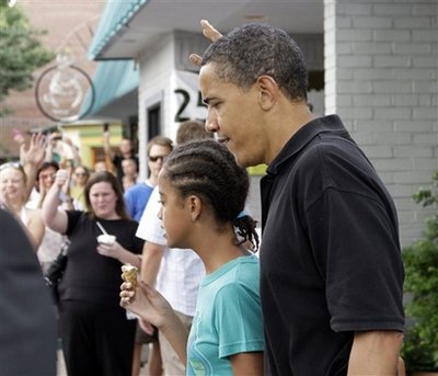據臺灣中廣新聞網報道,這個星期天是美國的父親節,奧巴馬在父親節前夕,忙里偷閑,在悶熱的午后,帶著兩個女兒去吃冰,他似乎短暫拋開了對食物熱量的警覺,大吃澆了糖霜以及杏仁的冰淇淋,第一千金也各自點了不同的冰品,父女三人在餐廳大約停留了15分鐘,奧巴馬還和店內顧客握手拍照,臨走又買了一些狗點心,要帶回去犒賞第一家庭的寵物狗。