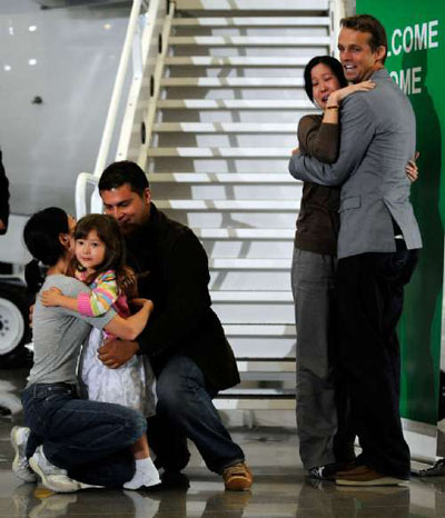 李承恩與丈夫邁克爾-薩爾達(dá)杰和四歲女兒漢納擁抱時,流下喜悅的眼淚。凌志美與丈夫伊恩-克萊頓擁抱,其它家人則擠在他們周圍,激動得流淚。