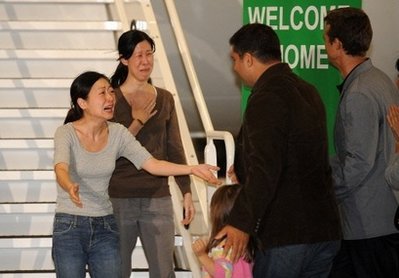三十二歲的凌志美、三十六歲的李承恩(前譯李尤娜)與克林頓所乘坐的飛機(jī)在洛杉磯附近的伯班克機(jī)場降落,兩名女記者下機(jī)時,激動得泣不成聲。