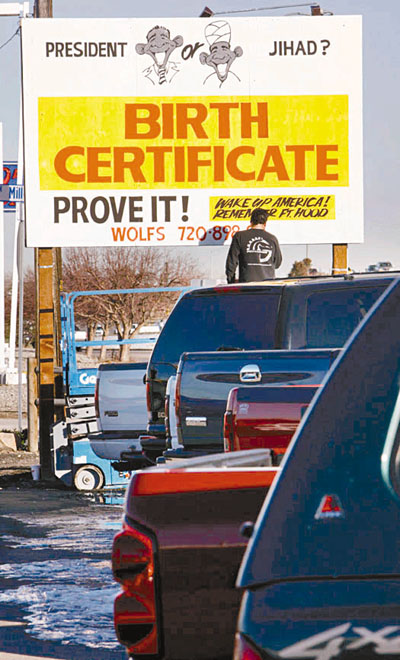 據香港《文匯報》22日報道,這幅廣告牌豎立于距離丹佛以西11公里的第70號州際公路旁,剛于前日由藝術家里爾完成。奧巴馬卡通肖像下有一個黃色大方格,上書“出生證書,請證明!“顯然在質疑,奧巴馬是否真的在夏威夷出生及擁有美國公民身份。