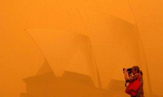 澳洲東部星期三遭遇數(shù)十年來最嚴(yán)重的沙塵暴,悉尼市被覆蓋,交通受阻。強(qiáng)風(fēng)把數(shù)以噸計(jì)的紅色沙塵傾倒在澳洲最大城市悉尼,使悉尼覆蓋在怪異的赤色迷霧中,著名悉尼歌劇院被涂上一層厚厚的沙塵。