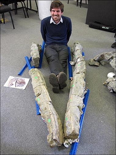 考古學家拼湊完畢后,才發現它原來屬于一頭恐龍的遺骨。而它體型之大,更是前所未見。強有力的下鄂,可以一口吞下整個人,或是把一輛汽車咬成兩半。