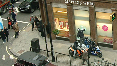 中新網(wǎng)3月10日電 據(jù)外電9日?qǐng)?bào)道,五名騎摩托車的“劫匪”停在珠寶商店門前,用大錘砸碎商店櫥窗,在眾目睽睽之下?lián)屪邇r(jià)值5萬(wàn)英鎊的珠寶。這一驚人的場(chǎng)景日前就發(fā)生在英國(guó)倫敦著名的“珠寶一條街”上。