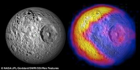 據報道,繞著土星軌道飛行的“卡西尼”號飛船近日拍下一幅關于土星的衛星——土衛一“米瑪斯”(Mimas)星球表面熱量分布的圖片,圖片顯示該衛星熱量分布很不均勻。科學家認為,這是由于其表面構成成分的差異所造成的。