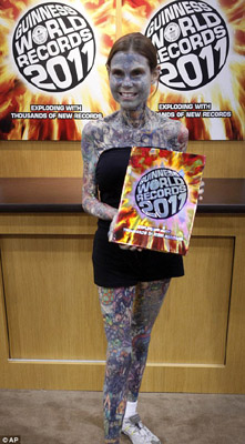 中新網5月27日電 據英國媒體報道,美國女孩希努斯(Julia Gnuse)全身95%都覆蓋著五顏六色的紋身。她也被吉尼斯世界紀錄評為世界上紋身最多的女人。5月26日,她出席了紐約圖書博覽會,也展示了自己身上的紋身。