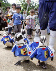 中新網6月11日電 據日本共同社網站報道,11日,身穿南非世界杯日本隊服的企鵝們出現在日本島根縣松江市的“松江 Vogel Park”公園,為出征世界杯的日本選手“吶喊助威”。