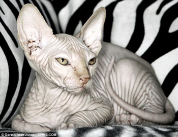 斯芬克斯貓是2005年認定的稀有品種,它們無毛,滿身褶皺。斯芬克斯貓脾氣很好,而且在某些方面它們更像狗,比如,容易與人親近而且對人忠誠。但是這種貓也需要些特殊保護。比如在夏天,主人需要給它們涂抹防曬霜以免曬傷;在冬天則需要給它們添加衣物來遮體保暖。斯芬克斯貓通常能活到9—15歲。