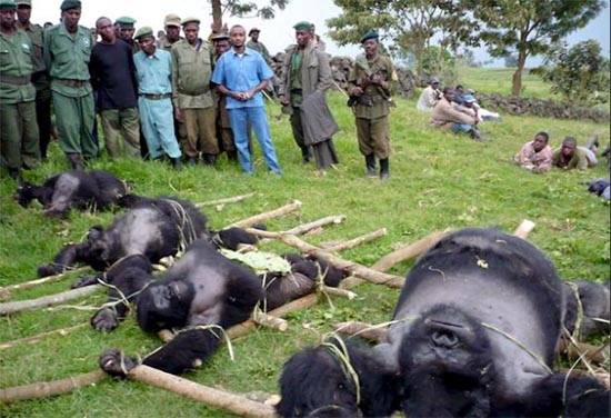 僅2007年6、7兩月就有7頭大猩猩被屠殺,而一頭名為Senkwekwe、重達500磅的銀背大猩猩的遇害照片更令村民們悲痛不已。除200只珍稀猩猩被殺害,森林砍伐加速,自然資源流失,更令人發指的是,過去10年共有150多名護林隊員在剛果民主共和國東部地區的五個公園中被謀殺。