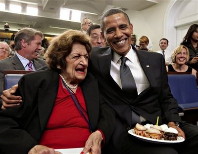 中新網(wǎng)8月5日電 8月4日是美國(guó)總統(tǒng)奧巴馬48歲生日。他于下午白宮舉行例行記者會(huì)時(shí),意外來(lái)到新聞簡(jiǎn)報(bào)室,手上捧著一盤(pán)蛋糕,送給也于當(dāng)天過(guò)生日的最資深記者海倫-湯瑪斯。