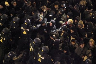 中新網12月13日電 據香港《文匯報》報道,舉行聯合國氣候峰會的丹麥哥本哈根,12日多達10萬人上街示威,要求各國切實執行打擊氣候暖化的措施,但示威演變成暴力沖突,約300名穿上黑衫的青年向警方投擲石塊,又擊碎玻璃窗,警方迅速制止,拘捕多人。