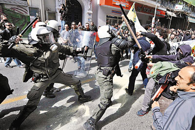 中新網3月12日電 綜合媒體報道,為抗議政府緊縮財政的計劃,希臘公務員和私營企業員工再度舉行全國性大罷工。當地時間十一日,首都雅典舉行的示威活動中爆發騷亂,數百名暴亂分子與希臘警方發生沖突,至少兩名警察受傷。截至目前,希臘警方已經逮捕了至少九名暴亂者。