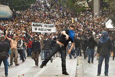 數萬名來自公職和私營兩大工會的成員昨日走上雅典街頭,高舉“國際貨幣基金組織和歐盟盜走了一個世紀的社會發展”、“富人需為危機負責”等橫幅,對政府實行嚴厲的財政緊縮政策表達不滿。