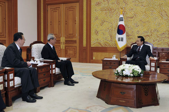 中新網(wǎng)8月23日電 綜合韓聯(lián)社等媒體報道,韓國總統(tǒng)李明博23日上午在青瓦臺接見了前來吊唁韓國前總統(tǒng)金大中的朝鮮吊唁團。