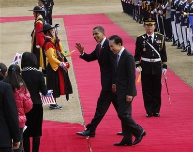 奧巴馬和李明博政府一直對(duì)朝鮮施加金融制裁,并告知朝鮮若放棄核計(jì)劃則可獲得巨額回報(bào)。奧巴馬于上周抵達(dá)亞洲,將于今日晚些時(shí)候回國(guó)。