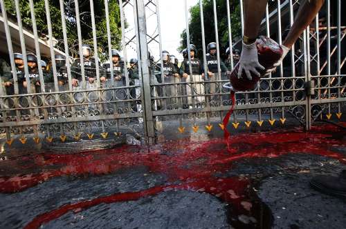 紅衫軍在曼谷的示威行動在十六日第二度升級,示威者們將從自己體內抽出的鮮血匯集在一個個塑料桶內,潑在總理府門前。這也是此次號稱“歷來規模最大的”集會示威過程中,首次“見血”。