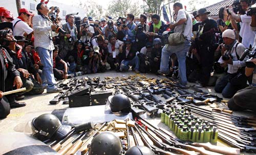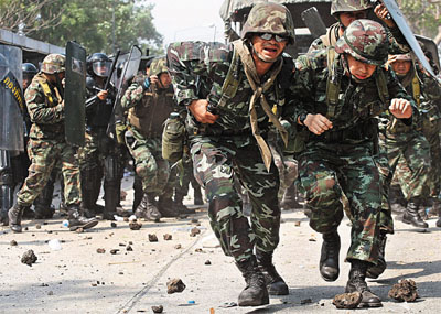 中新網4月10日電 據香港《文匯報》10日報道,泰國反政府“紅衫軍”繼續不理會緊急狀態令,昨日發起大游行,沖擊被禁播的電視臺,政府遂于連場示威中首次動武,軍警施放催淚彈及水炮,但仍然無果,最后棄械撤退,紅衫軍成功占領電視臺。傍晚多個商場的顧客及員工被促離開,傳警方部署在6個地點拘捕示威領袖,并在一個集會地點清場。