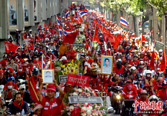 12日早上,紅衫軍在曼谷市區抬著11個棺材舉行游行,稱里面放著死于10日暴力沖突的喪生者遺體,借此向政府施壓,要求阿披實下臺。