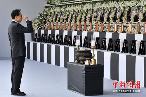 韓國總統李明博出席天安艦遇難官兵遺體告別儀式。