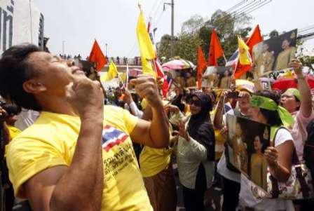 有大約300名親政府的“黃衫軍”周四到總理阿披實坐鎮(zhèn)的曼谷11步兵營外面集會,要求政府采取明確方案,以結(jié)束紅衫軍的“非法集會”和“恐怖主義”,并要求軍方運用力量,結(jié)束目前的混亂狀態(tài)。