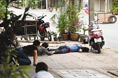 在示威區(qū),有居民自設(shè)圍欄,以免紅衫軍逃走時闖進(jìn)。部分居民更急急收拾細(xì)軟離開。46歲的拉達(dá)與女兒拖著行李離開時說:“他們關(guān)掉所有燈,我們已沒有食物……過去兩晚最危險,所以要離開。”