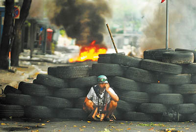 13日,為了逼迫占據(jù)曼谷繁華商業(yè)區(qū)已近兩個(gè)月的“紅衫軍”撤離,泰國政府切斷了該商業(yè)區(qū)的水電供應(yīng),“紅衫軍”隨即與軍警發(fā)生沖突。16日,“紅衫軍”點(diǎn)燃了作為路障的汽車輪胎,一股股濃煙騰空而起。此外,他們還把警察設(shè)立的交通檢查站潑上汽油并放火焚燒。
