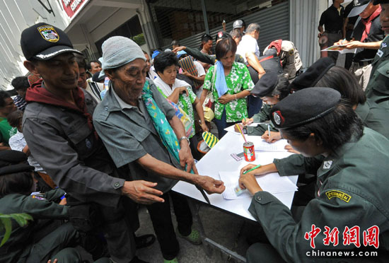 在警察總署等待回家的抗議者身邊都放著自己的家當,有些人神情沮喪,但仍有不少人仍然保持泰國人的輕松態度,在等待時談笑。離開的時候,一個婦人微笑著對記者揮手,男人們則神情肅穆地接受軍人檢查。