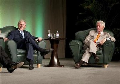 克林頓卸任后,多次與布什的父親、即前總統老布什合作,例如替南亞海嘯及超級颶風“卡特里娜”天災的災民籌款,兩人有一段時間經常走在一起。布什開玩笑道,不知道自己的父親花了多少時間與克林頓同場亮相。