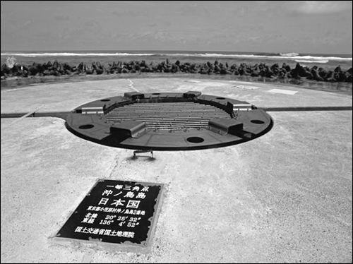 沖鳥礁位于東京都南方約1740公里處,南北長1.7公里,東西寬4.5公里,一直無人居住。其地質構造屬于珊瑚礁,本來由6塊巖礁組成,但由于長年被海浪侵蝕,正在不斷沒入海面或消失,現在只有兩塊巖礁露出水面。